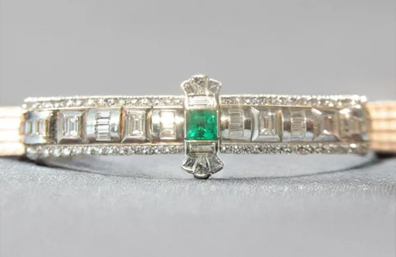 プラチナ、K14、ダイヤモンド、エメラルドが施された帯留をお買取させていただきました。